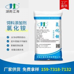 湖南江海環保實業公司生產的飼料級氯化銨是以農用或工業氯化銨為原料經過去雜、提純等工藝精制而成。產品純度高,重金屬離子含量低等特點。能作為非蛋白劑補充反芻動物蛋白質營養,也被廣泛作為反芻動物抗結石劑,奶牛產前的陰離子平衡劑,家禽抗熱應激藥物,應用前景十分廣泛。 產品包裝 內塑外編或按客戶要求 批準文號 湘飼添字(2019)230001 執行標準 Q...